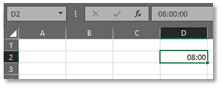 On s’aperçoit bien que la valeur de la cellule D2 (08:00) est bien égale à 8/24 soit 0,3333333.
