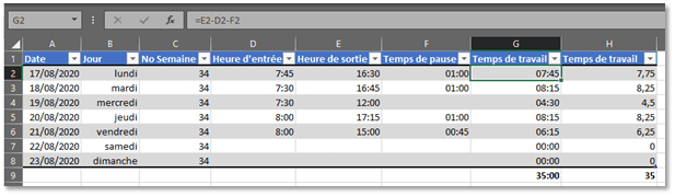 L’objectif est donc de pouvoir calculer le temps de travail par jour (en heures et en valeur décimale). Il s’agit d’une simple soustraction : « Heure de sortie » – « Heure d’entrée » – « Temps de pause ».